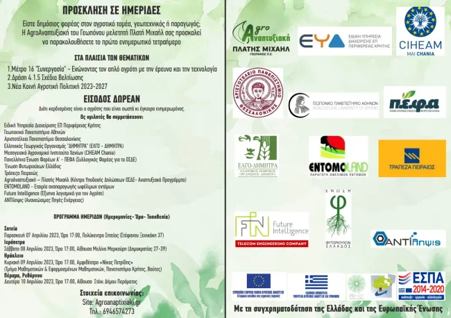 Είστε δημόσιος φορέας στον αγροτικό τομέα, γεωτεχνικός ή παραγωγός; Η AgroΑναπτυξιακή του Γεωπόνου μελετητή Πλατή Μιχαήλ σας προσκαλεί τους δημόσιους φορείς στον αγροτικό τομέα, γεωτεχνικούς και παραγωγούς να παρακολουθήσετε το πρώτο ενημερωτικό τετραήμερο. ΣΤΑ ΠΛΑΙΣΙΑ ΤΩΝ ΘΕΜΑΤΙΚΩΝ 1. Μέτρο 16 “Συνεργασία” – Ενώνοντας τον απλό αγρότη με την έρευνα και την τεχνολογία 2. Δράση 4.1.5 Σχέδια Βελτίωσης 3. Νέα…